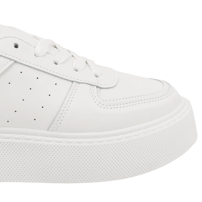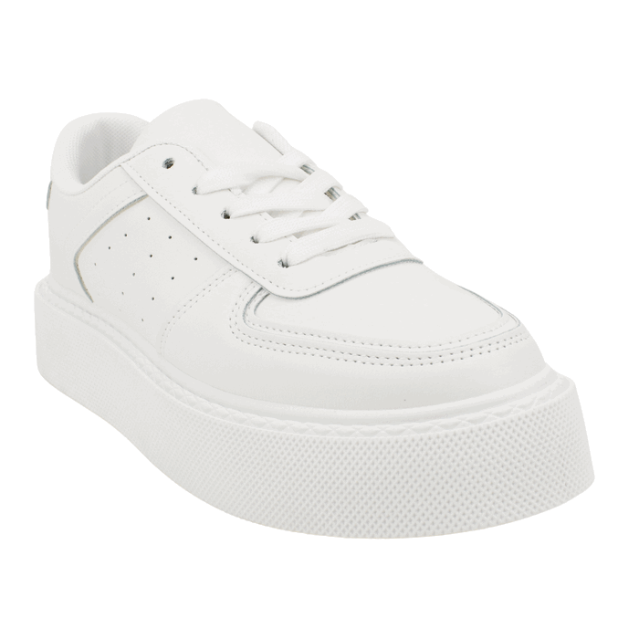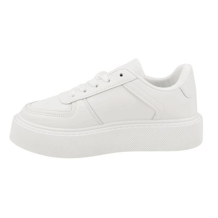 Zapatilla Mujer New Walk color blanca. Estilo Urbano. Un diseño minimalista y audaz. Estas zapatillas blancas de plataforma son la base perfecta para cualquier atuendo contemporáneo. Su estética chunky de suela gruesa no solo está a la vanguardia de la moda, sino que también ofrece un soporte robusto y una pisada increíblemente cómoda. El color blanco puro y la construcción de paneles lisos las hacen un calzado versátil, ideal para combinar con todo, desde jeans hasta vestidos casuales. Un esencial de armario que te dará estilo y comodidad en tu día a día. Ajuste mediante cordones. Plataforma de 3,5 cm de altura y caña de 7 cm de alto.