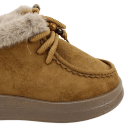 Zapato de Mujer New Walk color camel. Estilo Casual. Siente el abrazo del invierno en cada paso. Este zapato está diseñado para quienes no sacrifican el estilo por la comodidad durante los días más fríos. Con un acabado en gamuza sintética de alta calidad y un sofisticado detalle de chiporro en el cuello, es el calzado ideal para mantener tus pies temperados con un look moderno y acogedor. Plataforma de 3,5 cm alto y caña de 8,5 cm de altura.