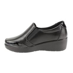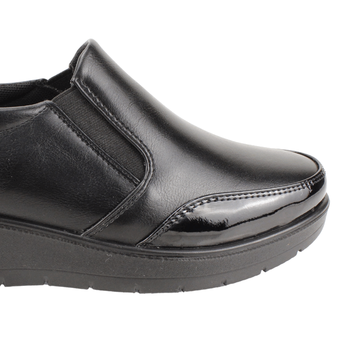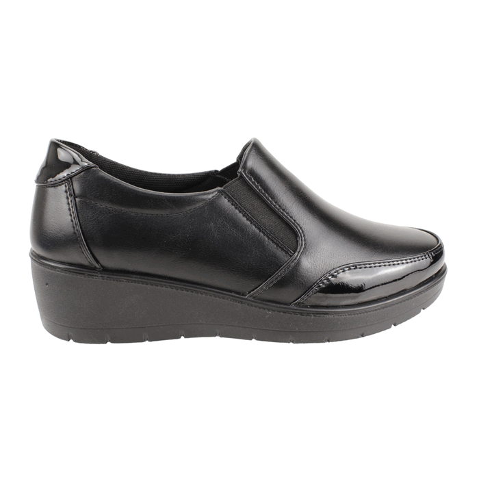 Zapatos de Mujer New Walk color negro. Estilo Casuales. Estos elegantes zapatos de mujer ofrecen la combinación perfecta de un estilo atemporal y la máxima comodidad. Su diseño clásico en color negro se realza con detalles de charol en la puntera y el talón, lo que les confiere un toque de sofisticación y brillo. Gracias a las bandas elásticas laterales ocultas, estos zapatos son fáciles de calzar y se ajustan de manera cómoda a tu pie. La suela de plataforma con una cuña de altura media no solo añade un poco de elevación, sino que también garantiza una pisada suave y estable, ideal para jornadas de trabajo o para un uso diario. Plantillas confort de Memory Foam. Ajuste tipo Slip On. Plataforma de 4,5 cm de alto y caña de 6 cm de altura.