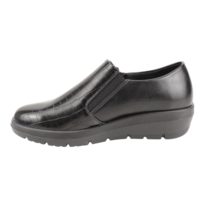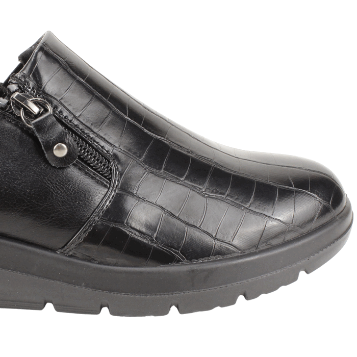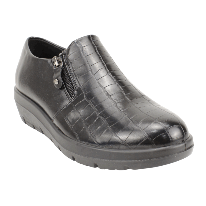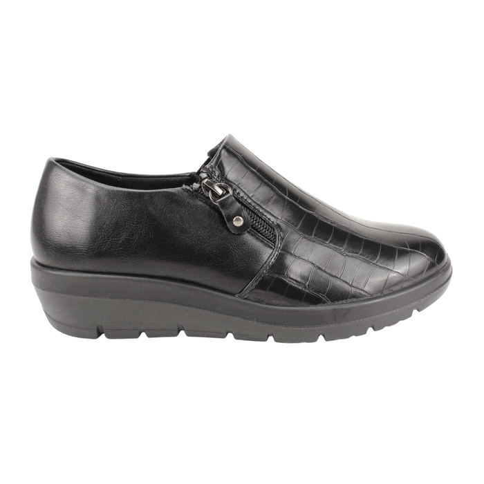 Zapato de Mujer New Walk color negro. Estilo Casual. ¡Añade un toque de sofisticación y audacia a tu look con estos zapatos bajos para mujer en color negro! El diseño se distingue por su elegante textura de cocodrilo en la parte delantera y una práctica cremallera lateral. Con una suela de cuña baja que asegura comodidad durante todo el día, estos zapatos son perfectos para la oficina, eventos casuales o cualquier ocasión donde quieras destacar. Plantilla confort con Memory Foam. Ajuste mediante cierre. Plataforma de 4 cm de alto y caña de 5,5 cm de altura.