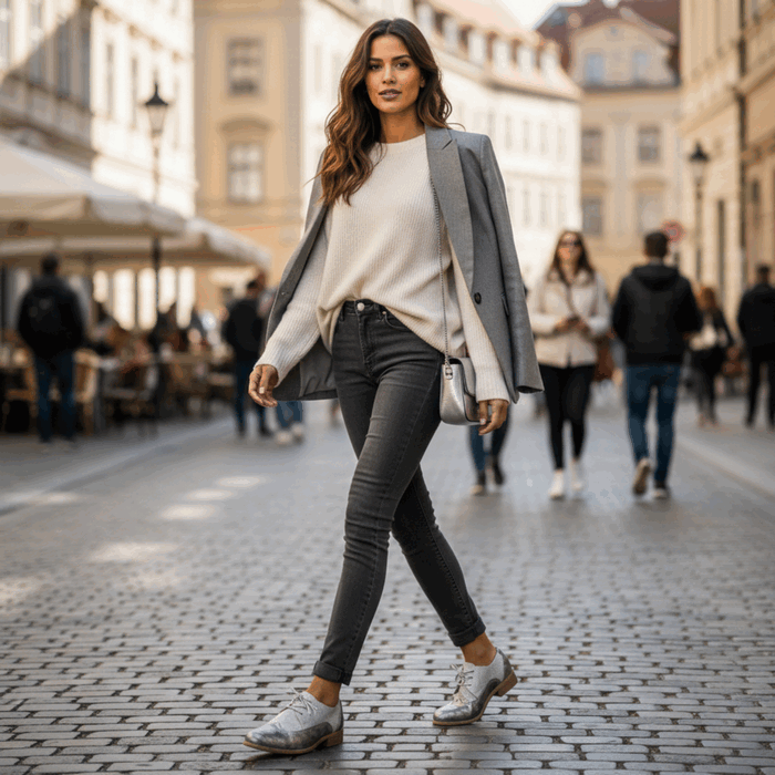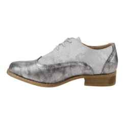Zapato de Mujer New Walk color plateado. Estilo Casual. Impresiona con un calzado único: nuestros Zapatos Oxford combinan la elegancia clásica con un toque audaz y moderno. El modelo está diseñado para la mujer que busca un zapato de vestir cómodo, pero con personalidad. Este diseño presenta una cautivadora combinación de texturas: la puntera y el talón en un vibrante color plateado metalizado con acabado envejecido, y el panel central en un material con textura de piel de serpiente en tonos grises o nude. El corte tipo Oxford, con su cierre de cordones, garantiza un ajuste seguro, mientras que el tacón bajo apilado estilo madera ofrece la comodidad necesaria para el uso diario o para darle un toque chic a tu look de oficina. Son ideales para combinar con jeans, pantalones de vestir o faldas midi. Ajuste mediante cordones. Taco Cuadrado de 3 cm de altura y caña de 5,5 cm de alto.