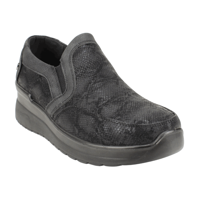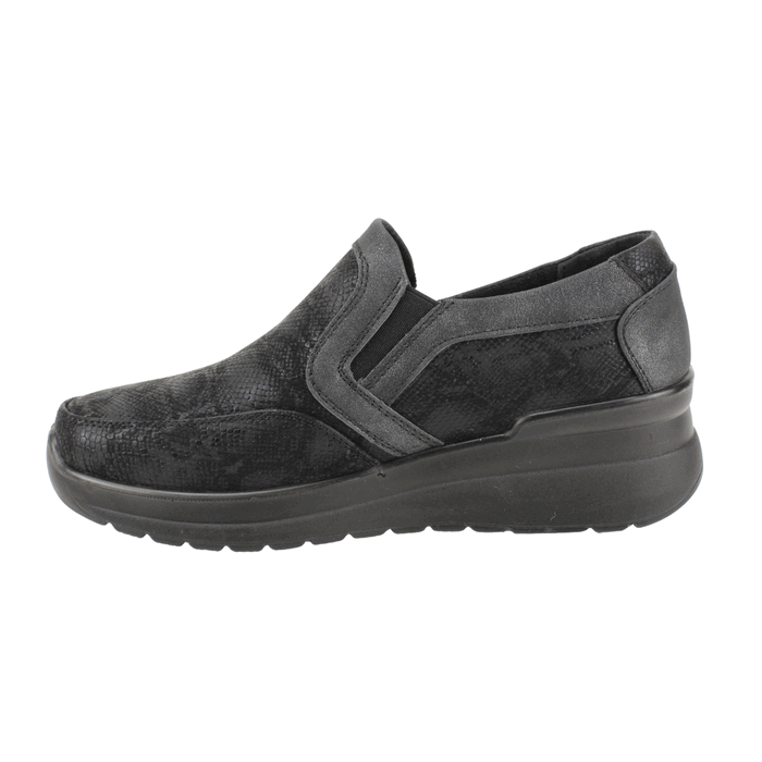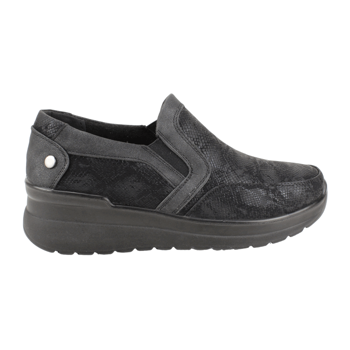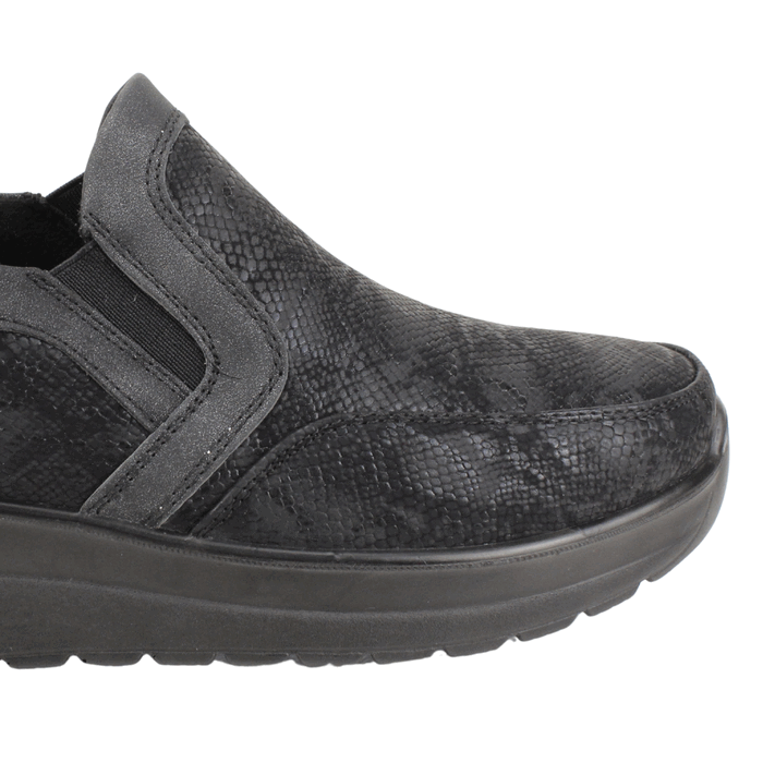 Zapatos de Mujer New Walk color negro. Estilo Casuales. Estos modernos zapatos tipo slip-on para mujer son la combinación perfecta de comodidad y estilo. Con un diseño versátil y contemporáneo, presentan una atractiva textura de piel de serpiente en tonos oscuros que les da un aire sofisticado y a la moda. El calzado cuenta con elásticos laterales ocultos que garantizan un ajuste perfecto y fácil de poner, mientras que la suela de plataforma de altura media ofrece una elevación discreta y un soporte inigualable para el uso diario. Son ideales para quienes buscan un calzado que se adapte a cualquier ocasión, desde la oficina hasta un paseo casual. Ajuste tipo Slip On. Plataforma de 5 cm de alto y caña de 5,5 cm de altura.
