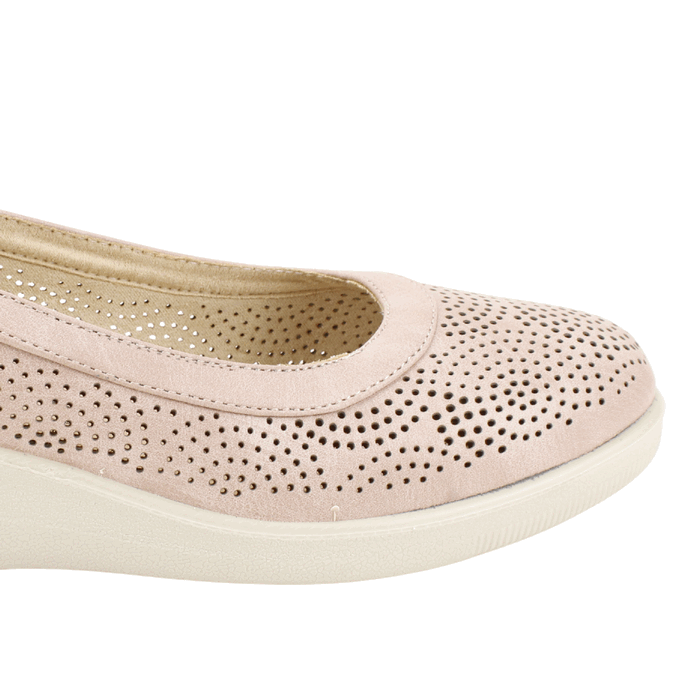 Zapato de Mujer New Walk color rosa. Estilo Casual. Perfectos para la temporada de calor, estos zapatos de cuña para mujer combinan estilo y frescura. El delicado color rosado y el diseño perforado no solo le dan un toque femenino y moderno, sino que también permiten que tus pies respiren, manteniéndolos frescos y cómodos. La cuña baja ofrece una elevación sutil sin sacrificar la estabilidad. Un calzado versátil y ligero, ideal para paseos, salidas casuales o para complementar un look de verano. Ajuste tipo Slip On. Taco Chino de 4,5 cm de alto y caña de 5,5 cm de altura.